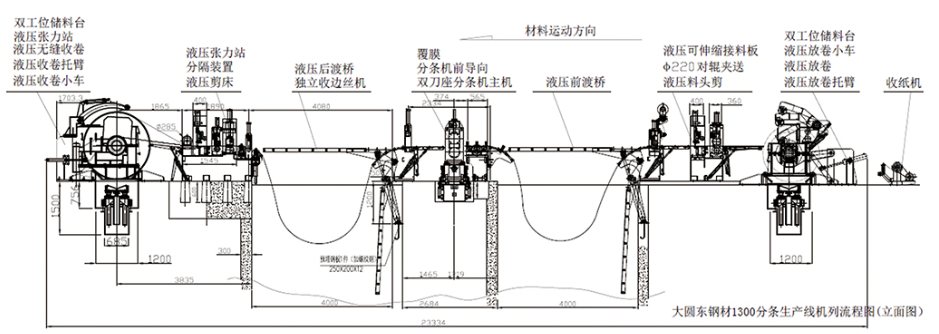 收紙機(jī)一雙工位儲料臺一上料小車一液壓放卷機(jī)一液壓托臂一接料引頭、鏟頭、二輥夾送+三輥整平、液壓料頭剪一覆膜一活套(前渡橋)一糾偏一壓料一縱剪一廢絲收卷一活套(后渡橋)一預(yù)分料、張力機(jī)一收卷一下料小車—液壓控制—電氣控制;