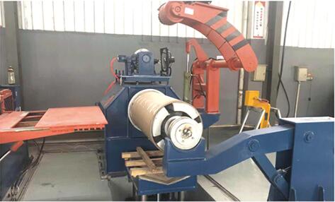 設備在工作時開卷機處于送料狀態(tài),板料進入整平機校平后,再經(jīng)電眼控制活套、側向機構進入NC定尺裝置,NC定尺裝置按設定好的尺寸定尺向后工序剪床送料;當NC送料達到設定尺寸時,設備停止送料同時將信號傳給剪床,由剪床將板料切斷,切下的板料經(jīng)輸送裝置送入集料架整齊堆垛,堆垛鋼板的升降臺可隨堆垛鋼板高度的增加而自動下降;當堆垛鋼板張數(shù)達觸摸屏設定值時,生產(chǎn)線自動停機,此時人工控制降下升降臺,將出料臺車開出,同時開進另一臺出料臺車,即進入下一工作循環(huán)。
