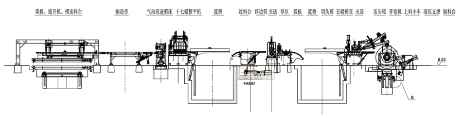 本設備的工作流程:本設備是將鋼板(各種金屬材料卷)通過整平后、定尺橫剪的方式把鋼板加工成客戶需要尺寸的專用剪切設備。該生產(chǎn)線的主要設備由收紙機、液壓上料小車、開卷機、接料鏟頭、整平主機、渡橋、NC定尺送料機、靜電覆紙機構、高速剪床、集料等機構構成,中間輔以運料、緩沖、引導、輸送、出料等裝置。