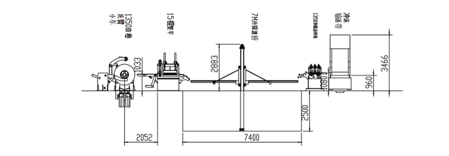 液壓上料小車→開卷機(jī)→接料鏟頭→整平主機(jī)→渡橋→NC偏擺定尺送料機(jī)→沖壓設(shè)備→圓片輸送帶(液壓系統(tǒng)、氣動(dòng)系統(tǒng)、電控系統(tǒng))